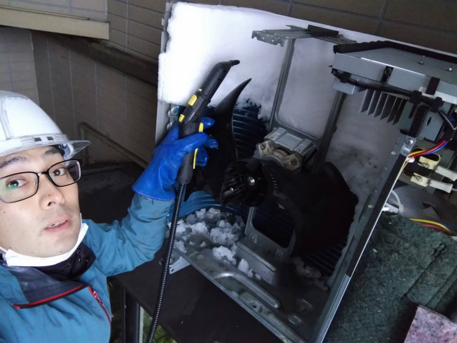 室外機を傷つけないよう機材を使用し、丁寧に霜だけを取り除きました。
